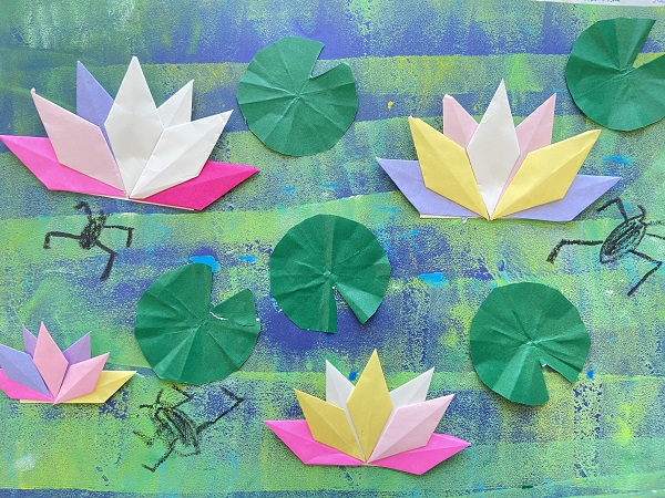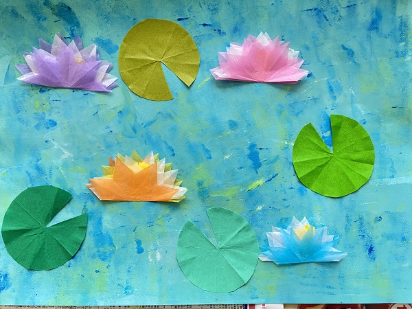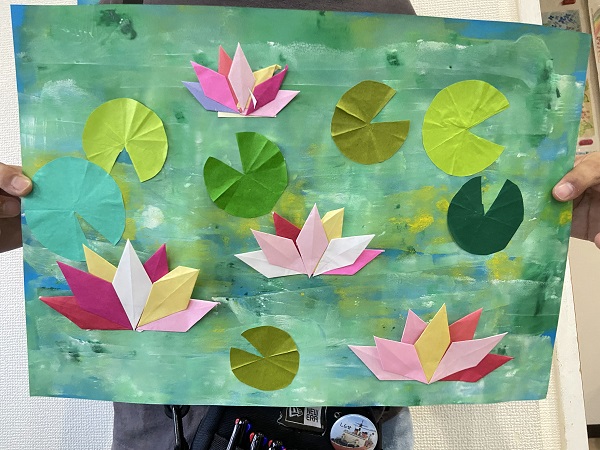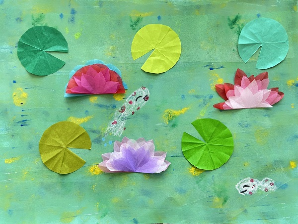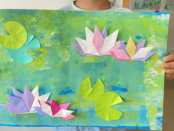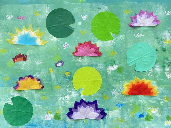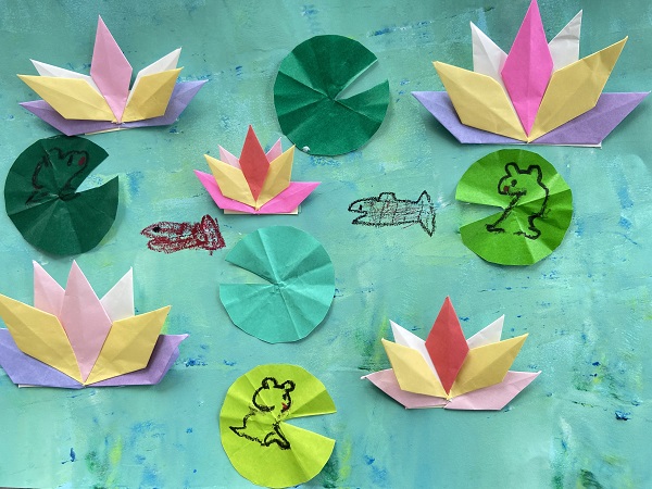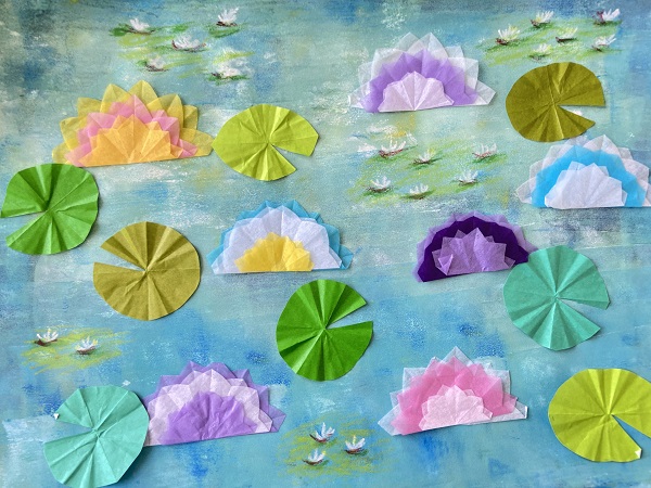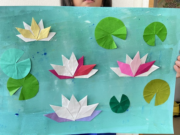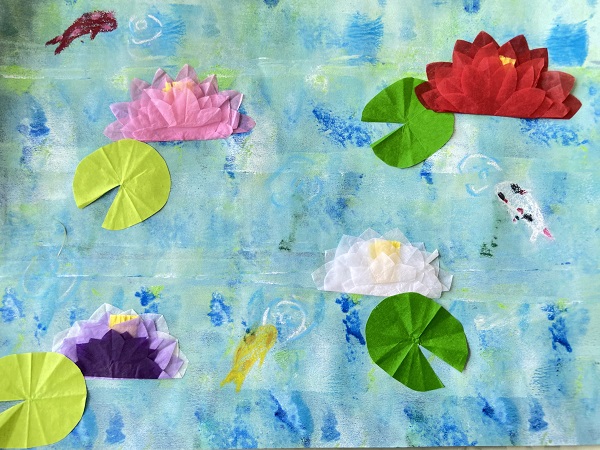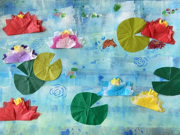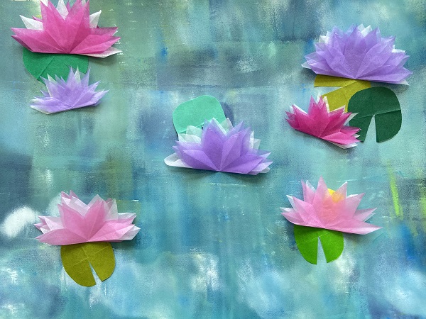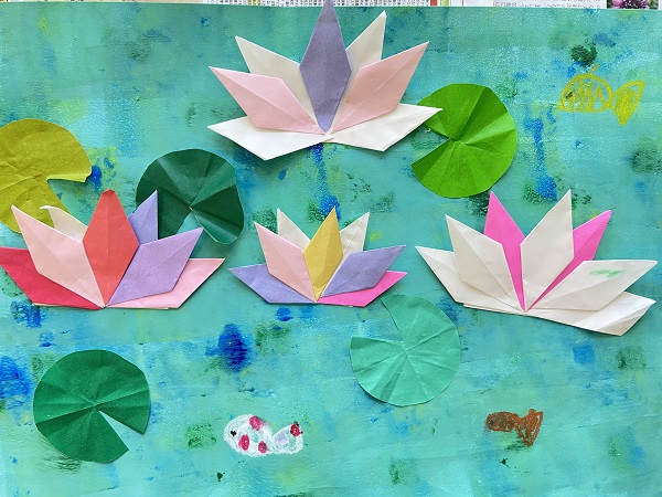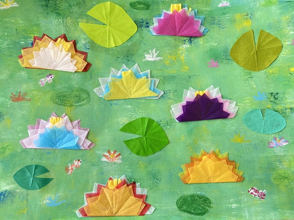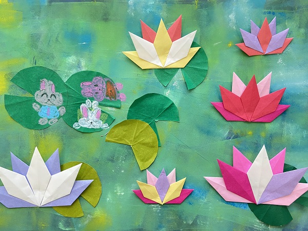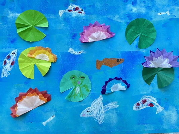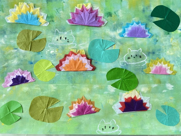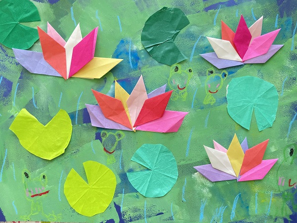 その池の水面に浮かぶ丸い葉とやさしい色合いの花を折り紙やお花紙で作って表現しました。
