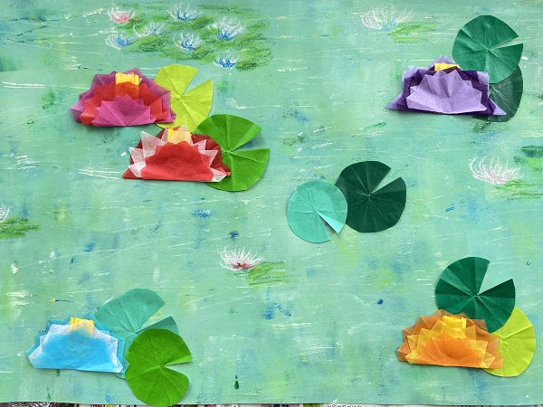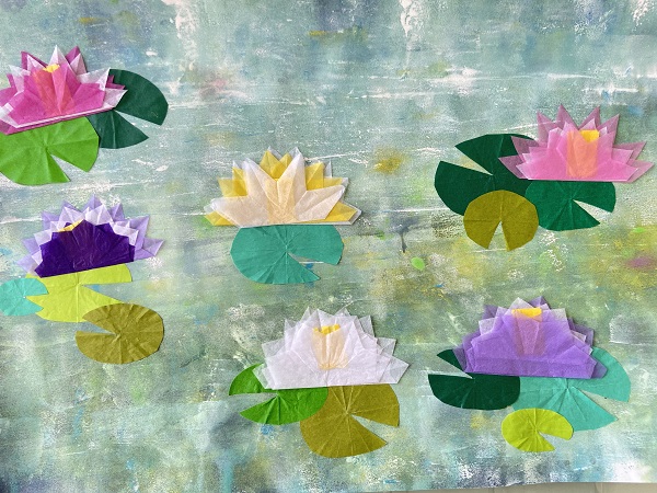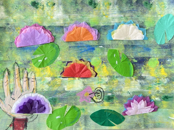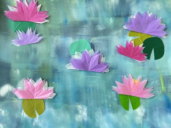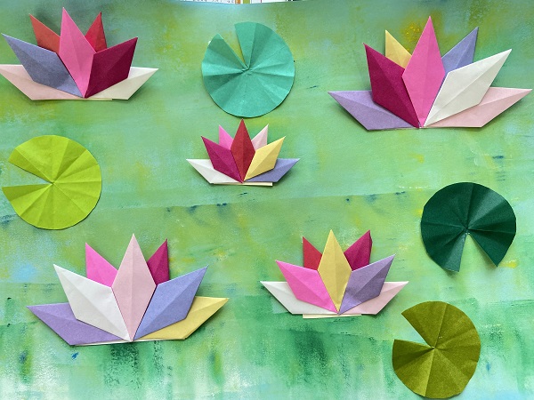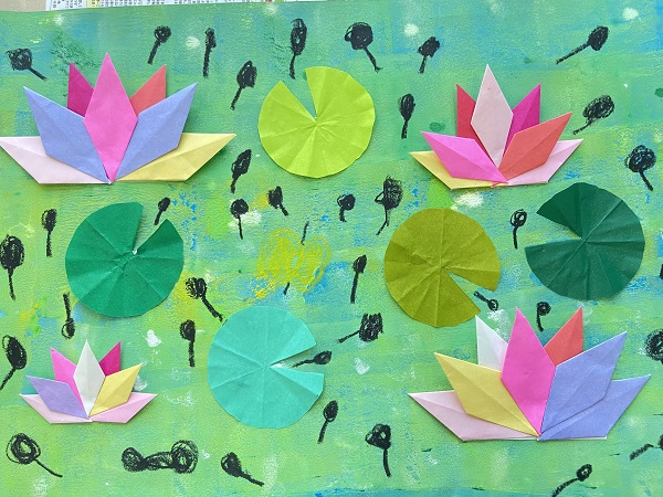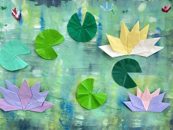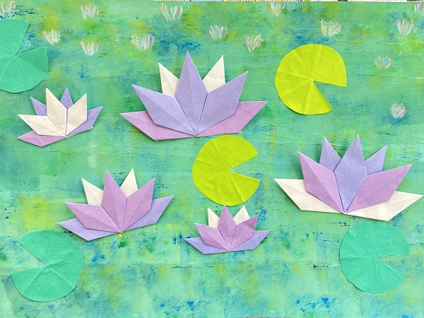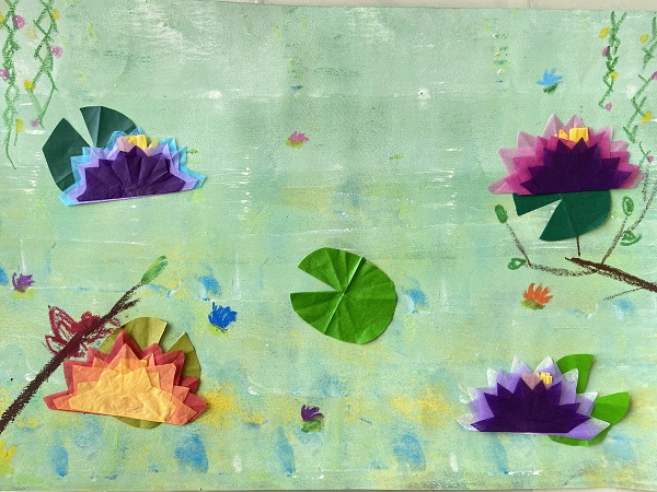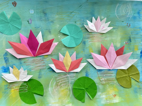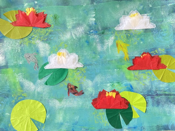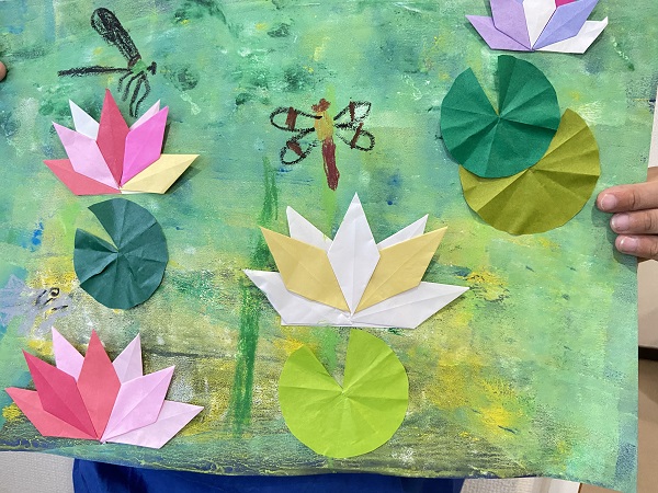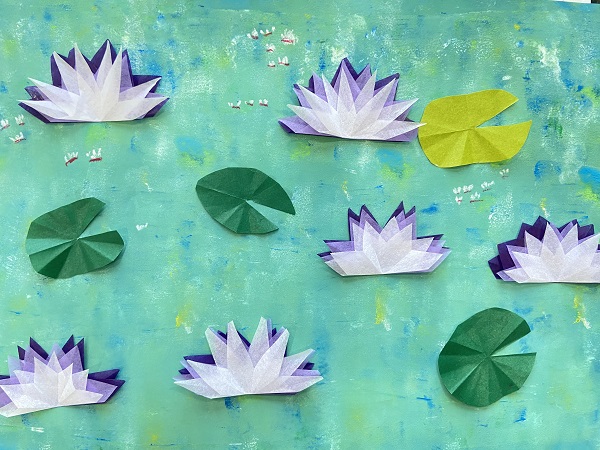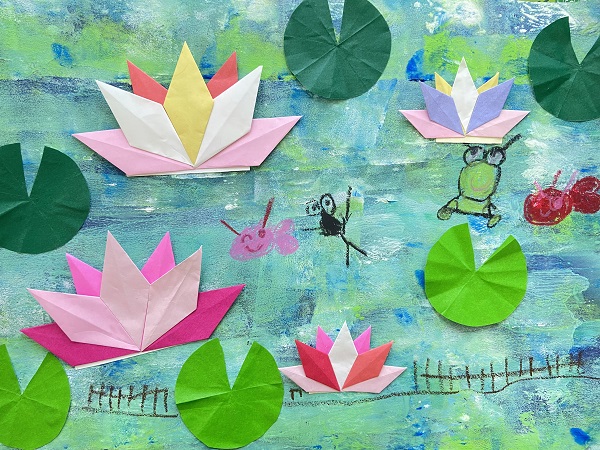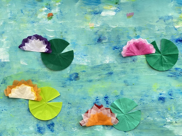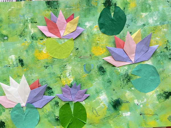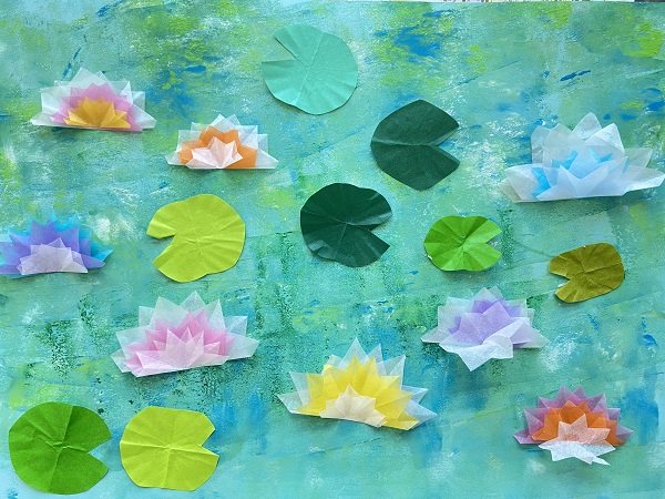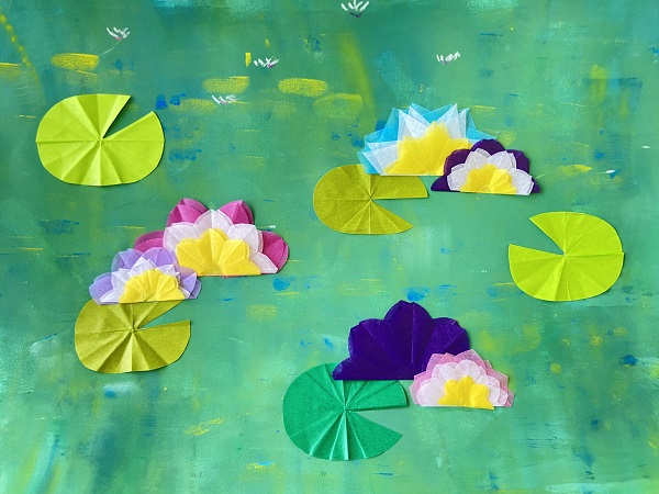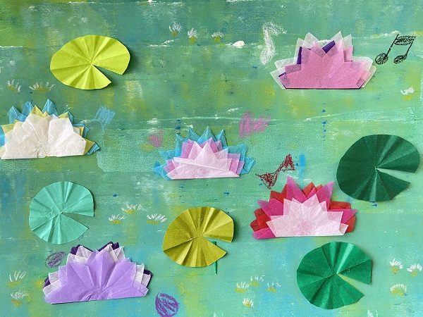 その池の水面に浮かぶ丸い葉とやさしい色合いの花を折り紙やお花紙で作って表現しました。