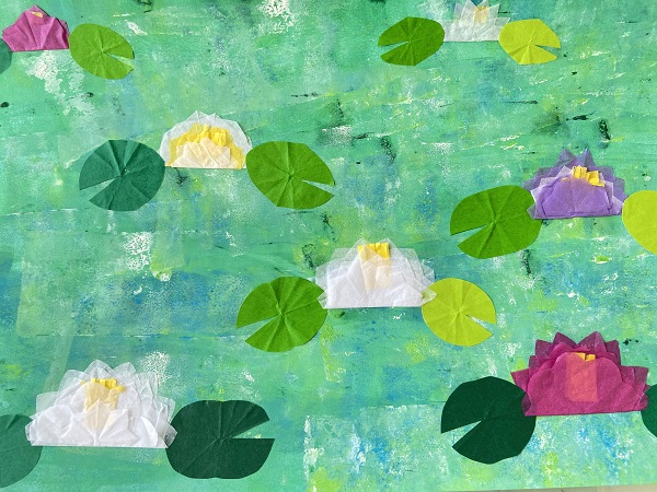 そこで、「睡蓮」の作品を鑑賞しながら、深い池の色彩をスポンジローラーで自由に表現し、