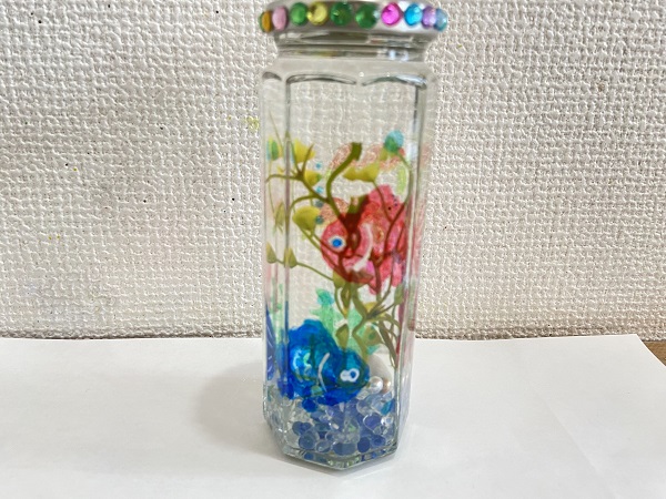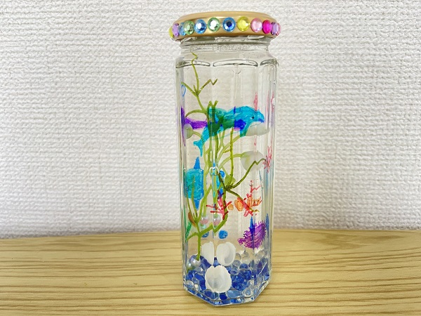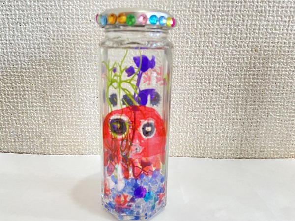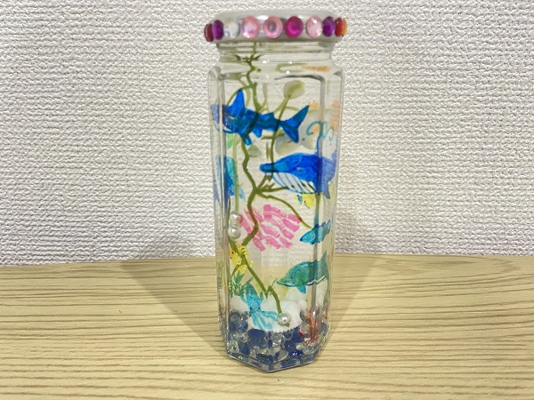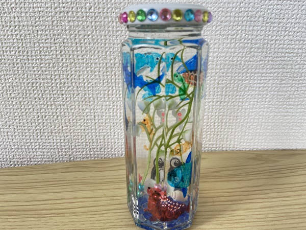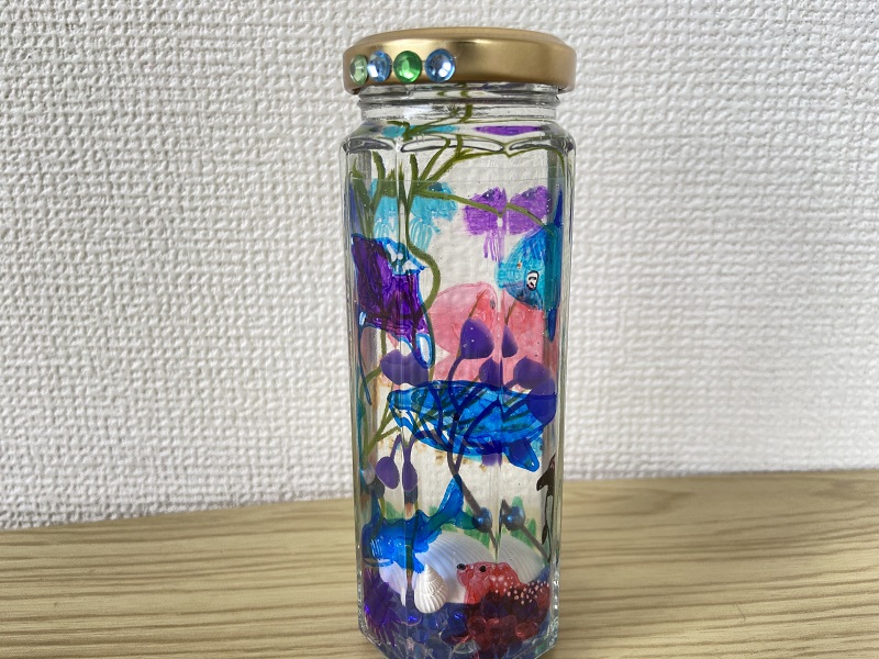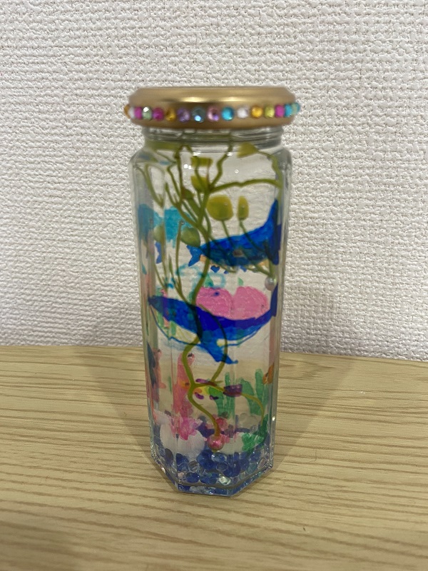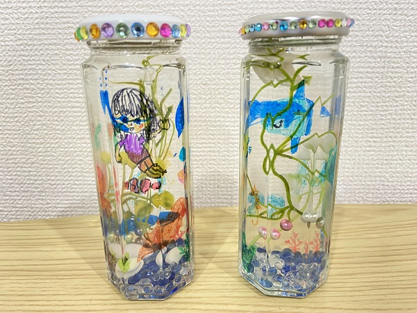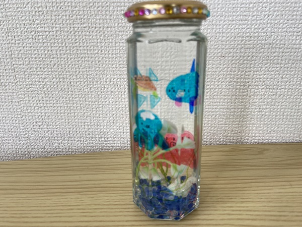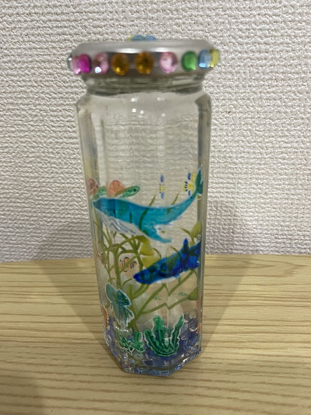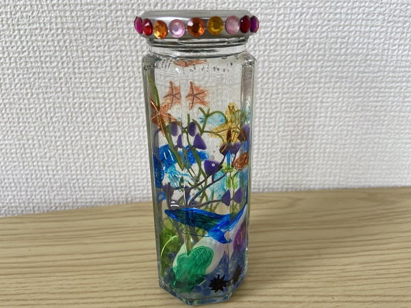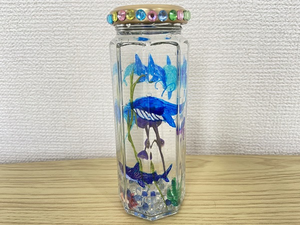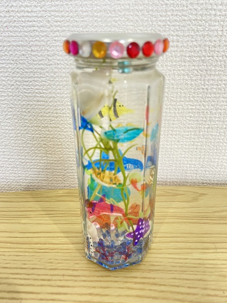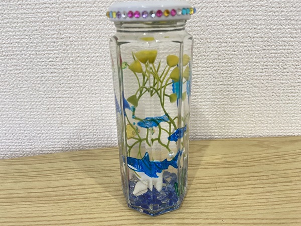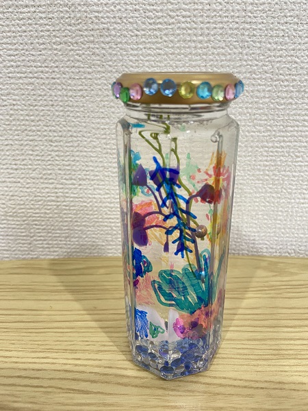 今回は、透明なフィルムに熱帯魚や金魚などの好きな鑑賞用の魚を描き、小さなガラス瓶に入れて飾りました。