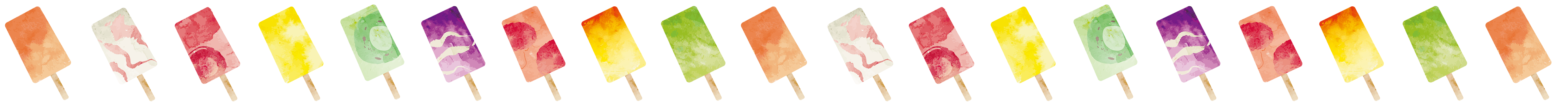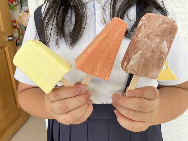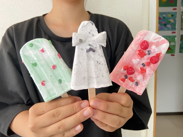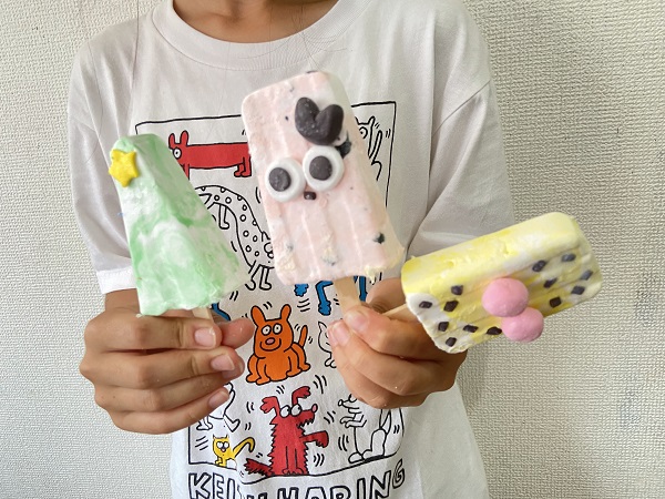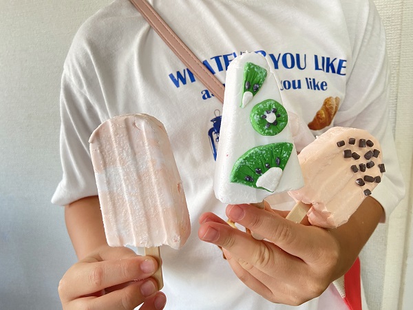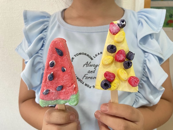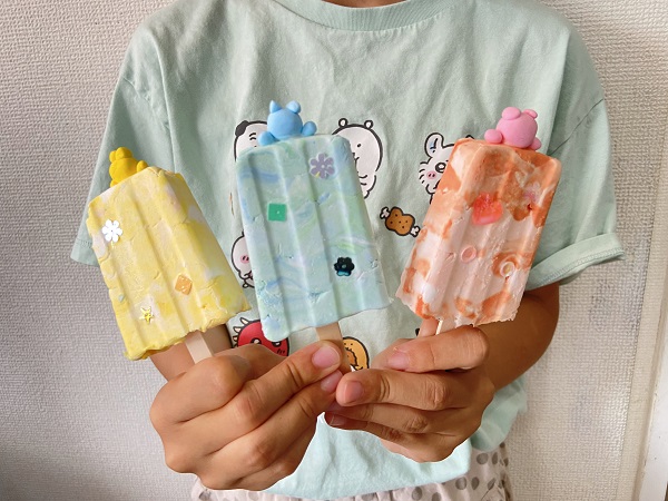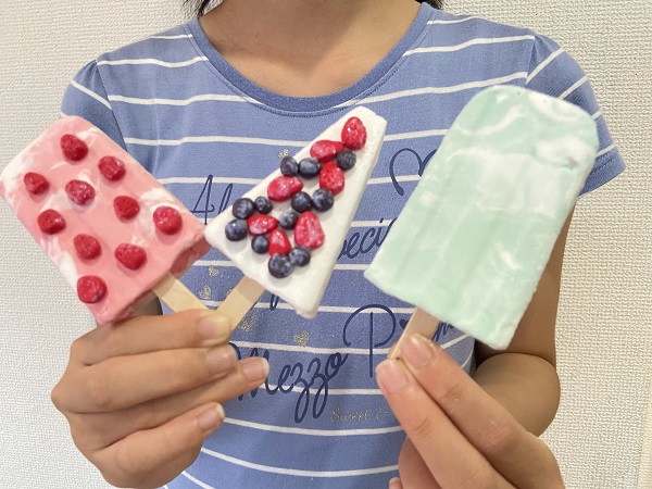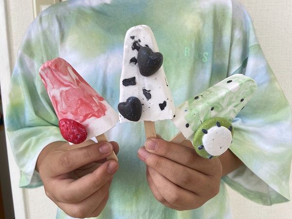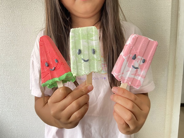 スイカの形にしたり、ミント色のアイスにチョコチップスを混ぜたり、バニラ色のアイスにフルーツを固めたりして、見ているだけで舐めたくなるカラフルな棒アイスを作りました。